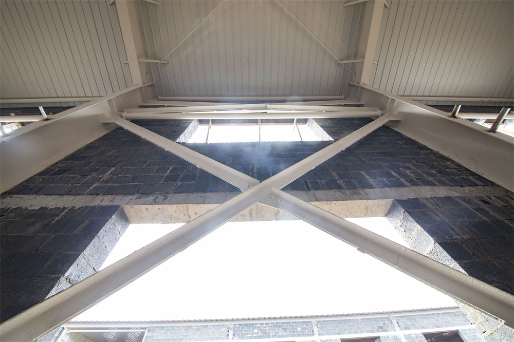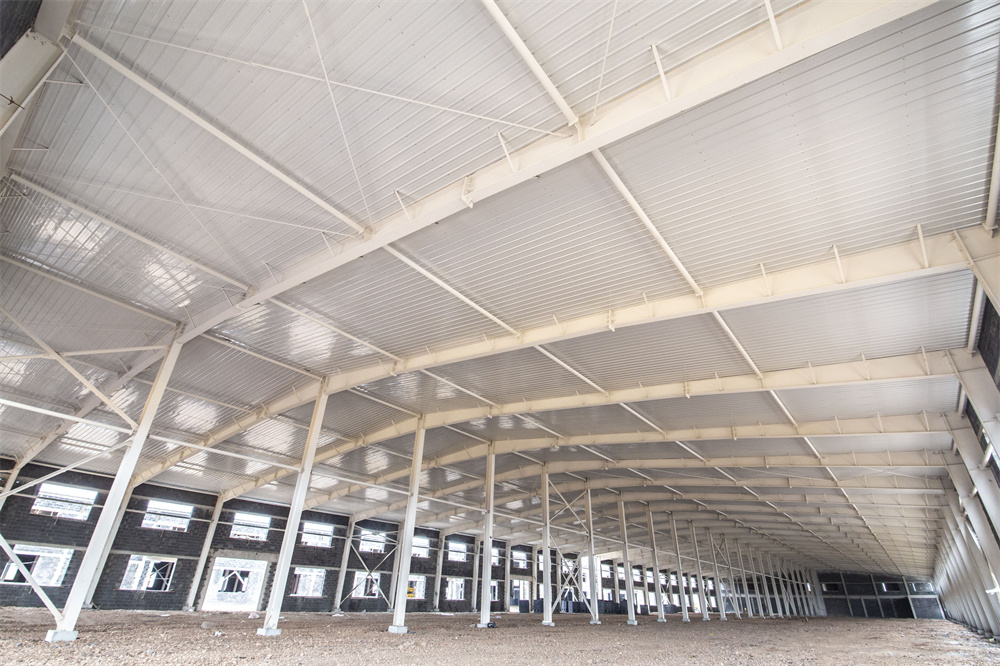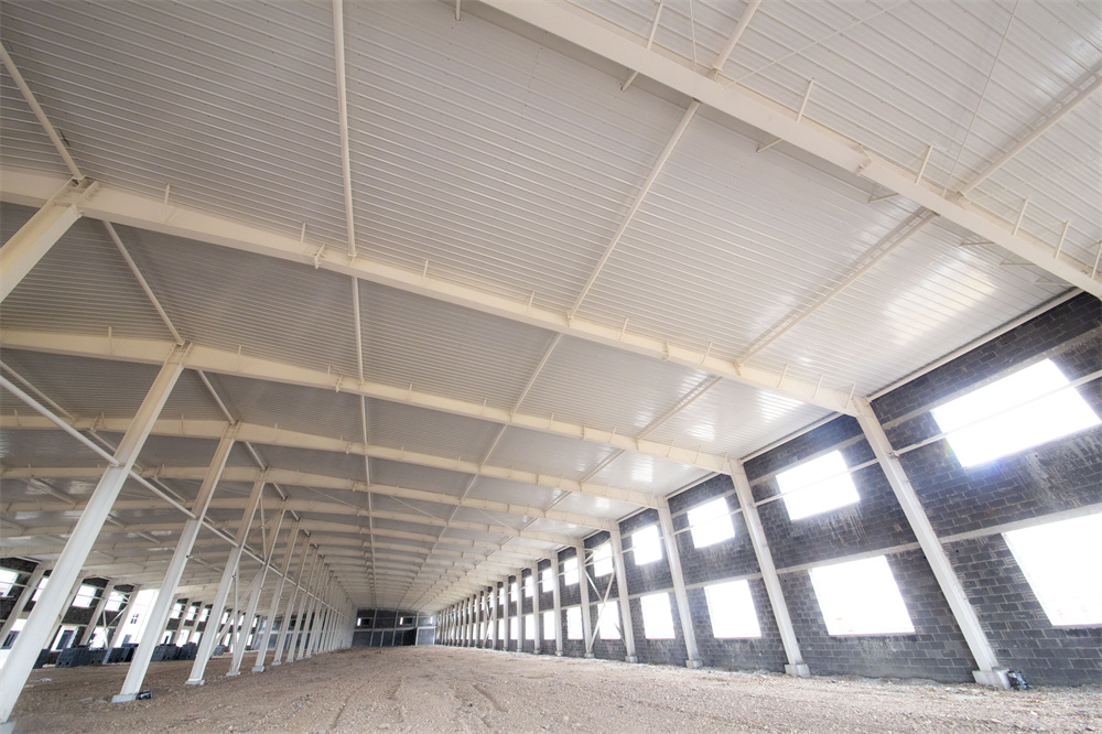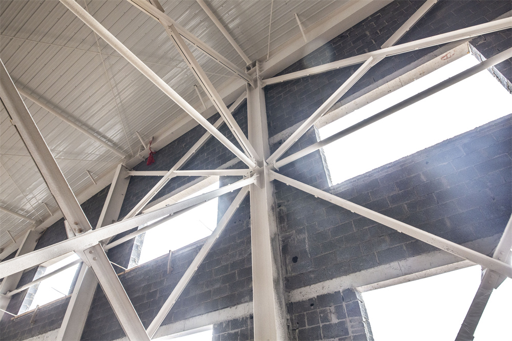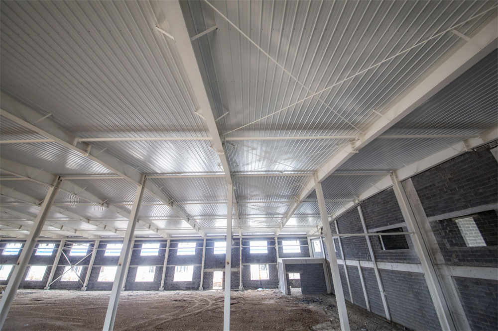 項目特點:本工程為共計兩棟單體1-廠房、2-廠房。廠房長度159.3m、寬度46m、檐口高度8.1m。局部二層為混凝土結(jié)構(gòu)。室內(nèi)外墻體均為土建墻體,屋面保溫為雙層75mm厚玻璃絲綿現(xiàn)場復(fù)合板,屋面外板為820型角馳板。室內(nèi)屋面懸掛噴淋系統(tǒng),土建墻體與鋼結(jié)構(gòu)連接節(jié)點復(fù)雜,混凝土結(jié)構(gòu)施工與鋼結(jié)構(gòu)施工交叉作業(yè),增加施工難度。